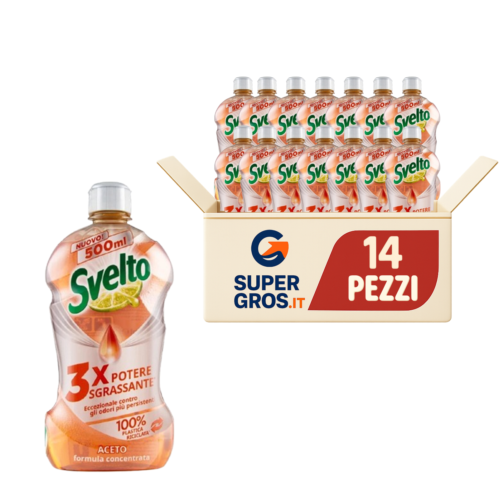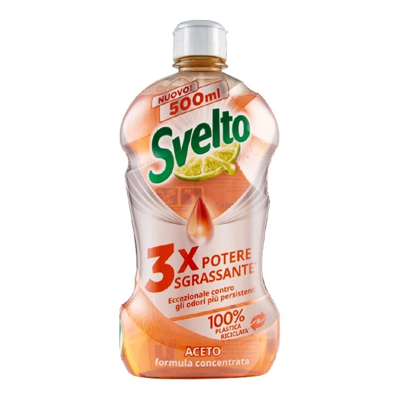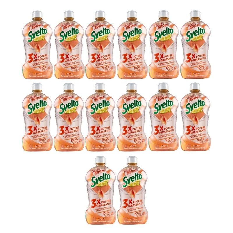 Il Svelto Aceto Concentrato 500 ml, in pacco scorta da 14 flaconi, è un detersivo per piatti a mano con formula concentrata 3X, sviluppato per rimuovere efficacemente il grasso più ostinato, lo sporco difficile e i cattivi odori.
